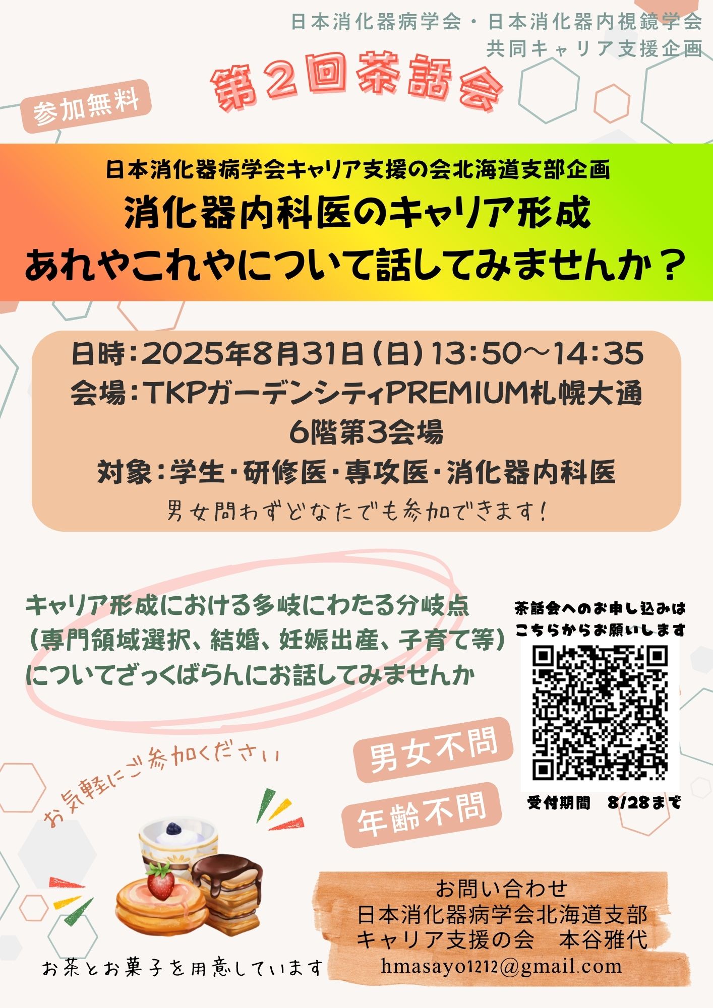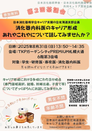 ![]() | 第2回茶話会 消化器内科医のキャリア形成 あれやこれやについて話してみませんか? 参加ご希望の方は、下記URLよりお申し込みください。 https://docs.google.com/forms/d/e/1FAIpQLSfcvDxc 4RmbfF3OMr_Q9jnuaQTQAOheyty9 XtFEZ7KOU_-Vlg/ viewform お申込み期限:8月28日(木) どうぞよろしくお願い申し上げます。 |